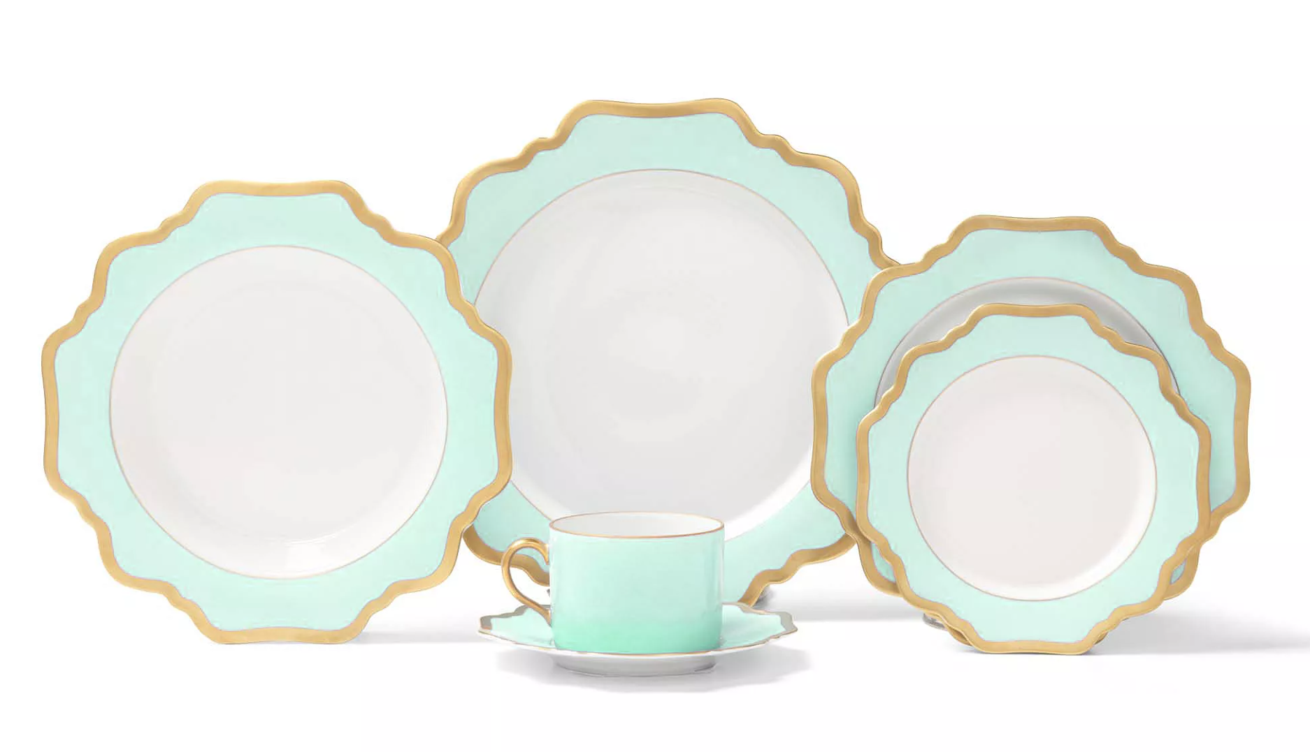 Add a touch of elegance to your dining experience with Anna's Palette, antique shaped dinnerware. Crafted from porcelain in a stunning aqua green hue, this dinnerware features a delicate scalloped gold edge for a sophisticated touch. Mix and match to create a unique and stylish table setting.
