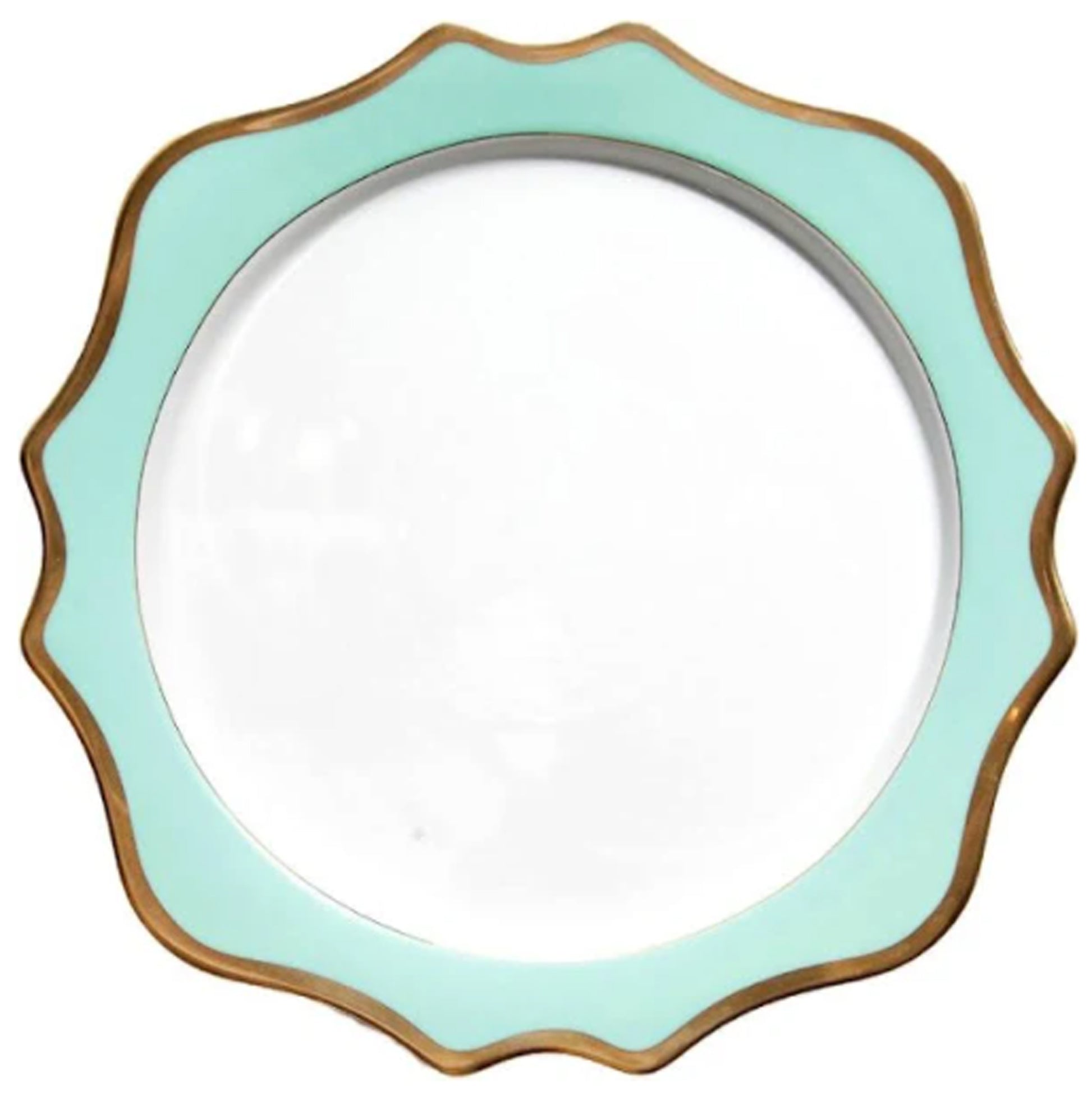 Add a touch of elegance to your dining experience with Anna's Palette, antique shaped dinnerware. Crafted from porcelain in a stunning aqua green hue, this dinnerware features a delicate scalloped gold edge for a sophisticated touch. Mix and match to create a unique and stylish table setting.