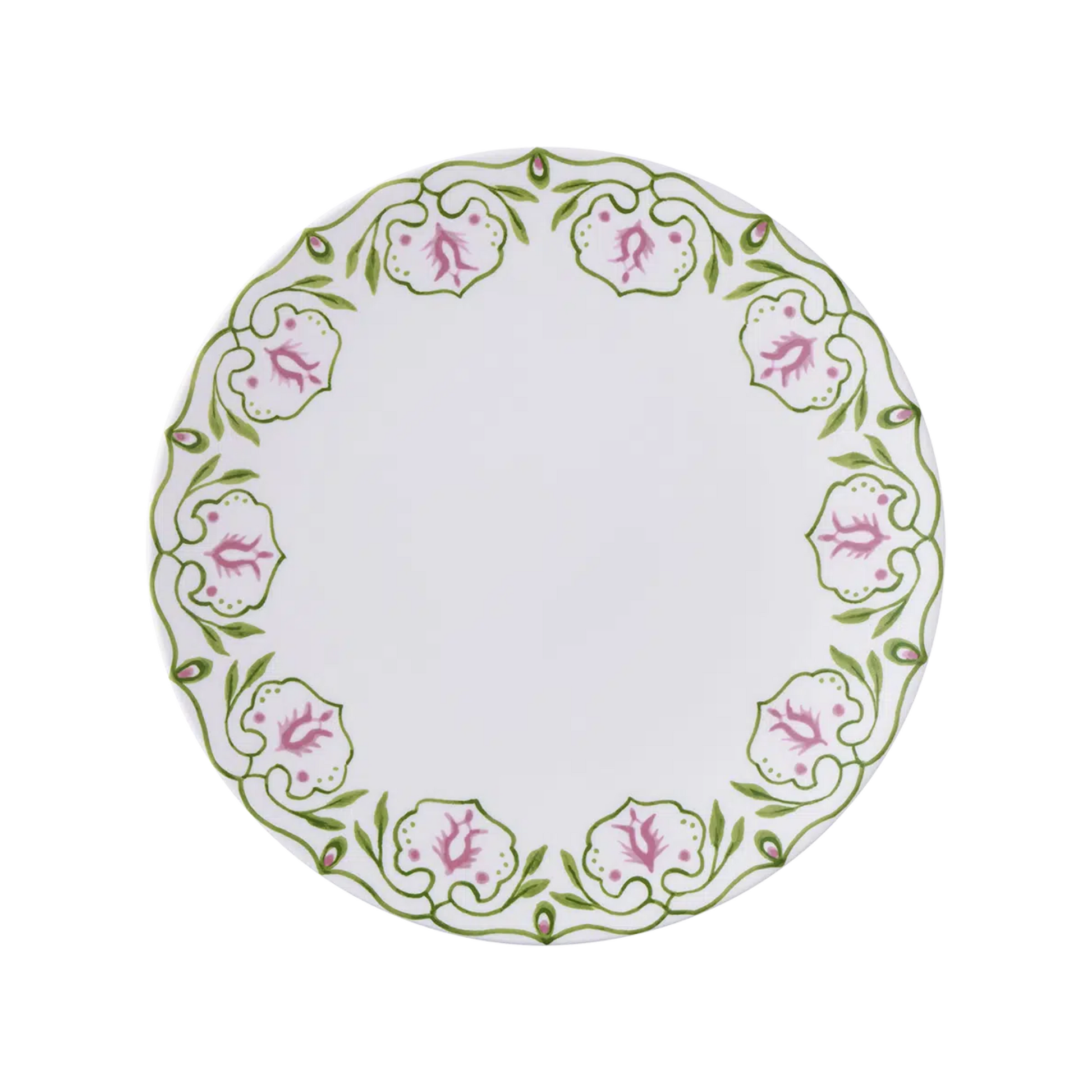 Fine bone china collection made in England, commissioned for Cobblers Cove. The Camelot collection designed in collaboration with Sam de Teran for the luxury boutique hotel reflects the tranquility and charm of the Caribbean setting. The striking pink and green patterns create a vibrant dinnerware setting or tea service suitable for both special occasions and everyday use. This dinner plate is designed to serve main courses and can be layered with the alternative dinner plate pattern.