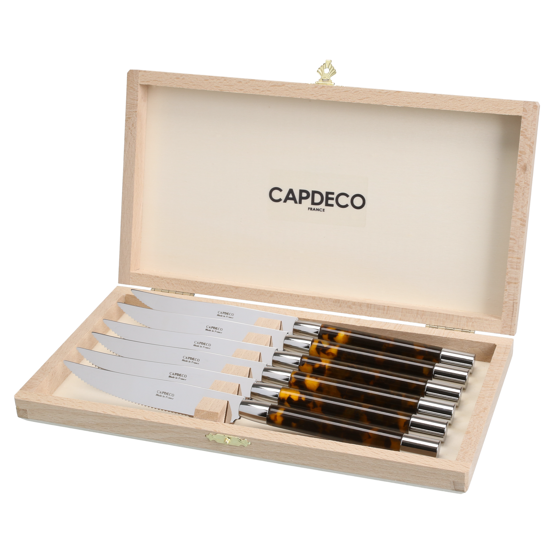 The Conty set of 6 steak knives combines elegance and performance, offering exceptional sharpness to effortlessly cut through your meats. Each knife features a serrated blade, ensuring easy slicing even through the toughest cuts. The refined design, with ergonomic handles and a chrome base, provides a comfortable grip and perfect balance. Presented in a stylish case, this set of high-quality stainless steel steak knives is perfect for a sophisticated and durable table setting.