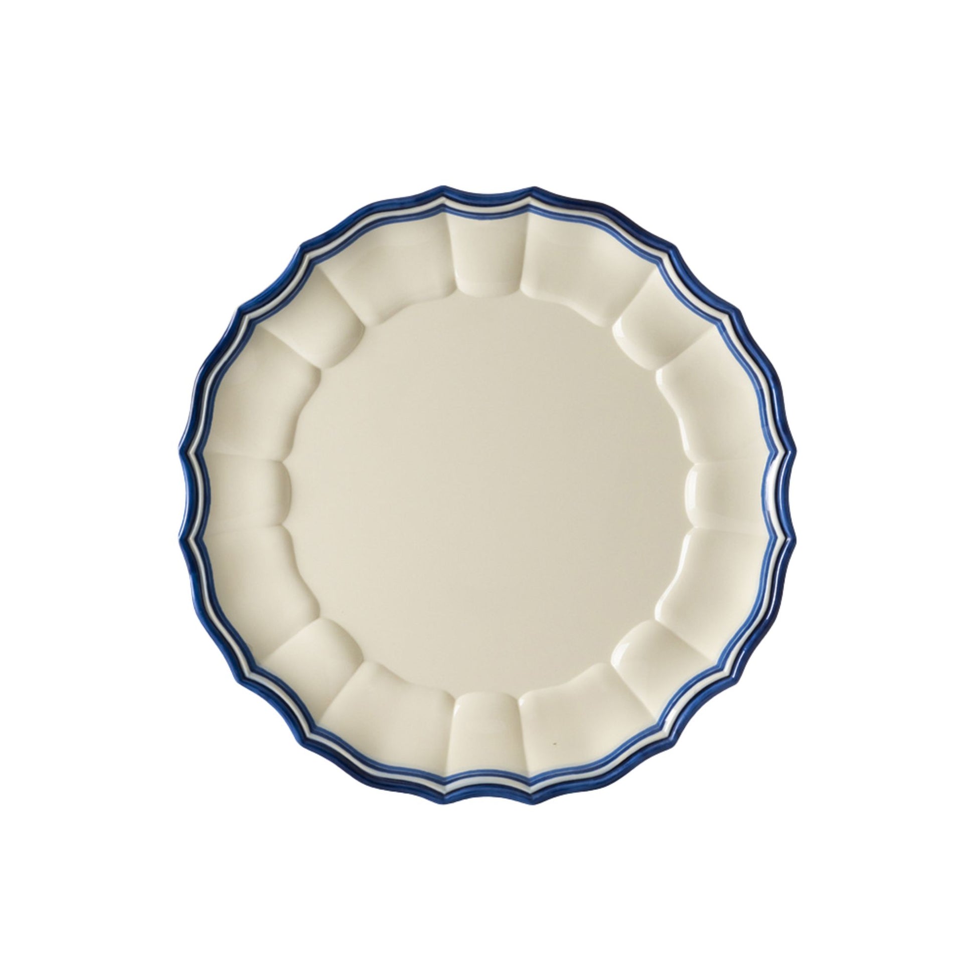 Durable melamine dinnerware for indoor/outdoor use decorated with a beautiful, scalloped edge border.