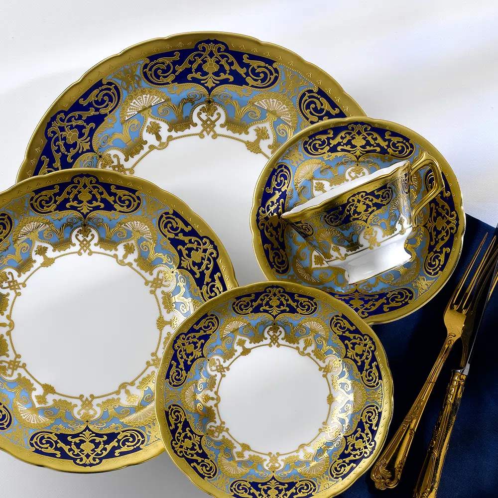 In Royal Crown Derby's long history, there has been a rich heritage of exquisite tableware. This luxurious and lavish tableware is carefully hand applied with 22K gold on a choice of three background colors. Fired up to eight times, the true craftsmanship is showcased.