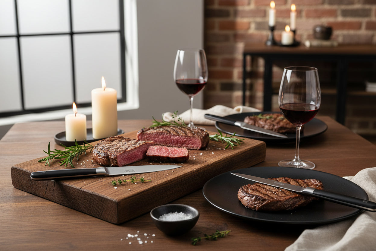 Set of 4 steak knives packaged in gift box with magnetic closure.