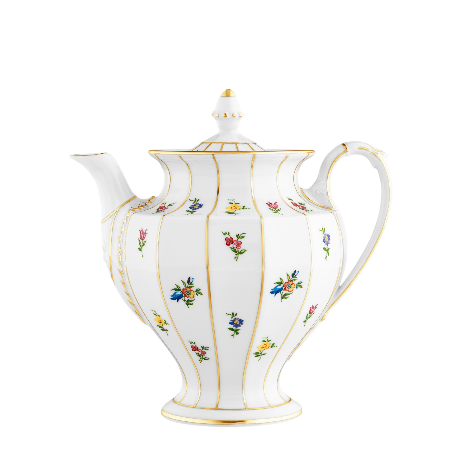 The MILLE FLEURS decor exudes the cheerfulness of a dreamy Biedermeier garden with its airy scattered flowers. With this decor, the FÜRSTENBERG Form GRECQUE is a very classic service for the Biedermeier period, because scattered flowers were the most important ornament of the era.