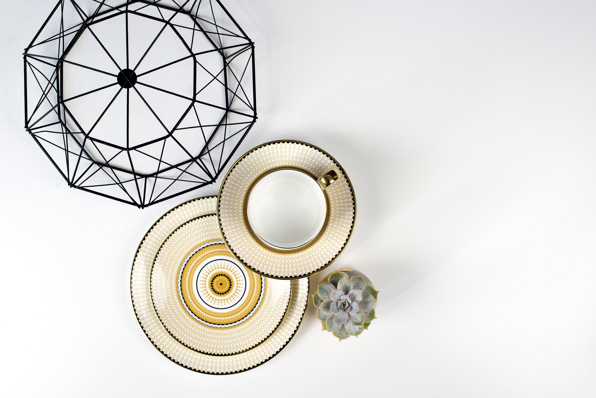 Inspired by architectural detail, mechanics, and the atomic attractions that bind materials together, the Oscillate tableware collection features a surface mesh design that compliments the fine bone china forms it adorns. Offered in a rich and warm Ochre Yellow the lustrous Oscillate collection is hand finished in 22K gold.