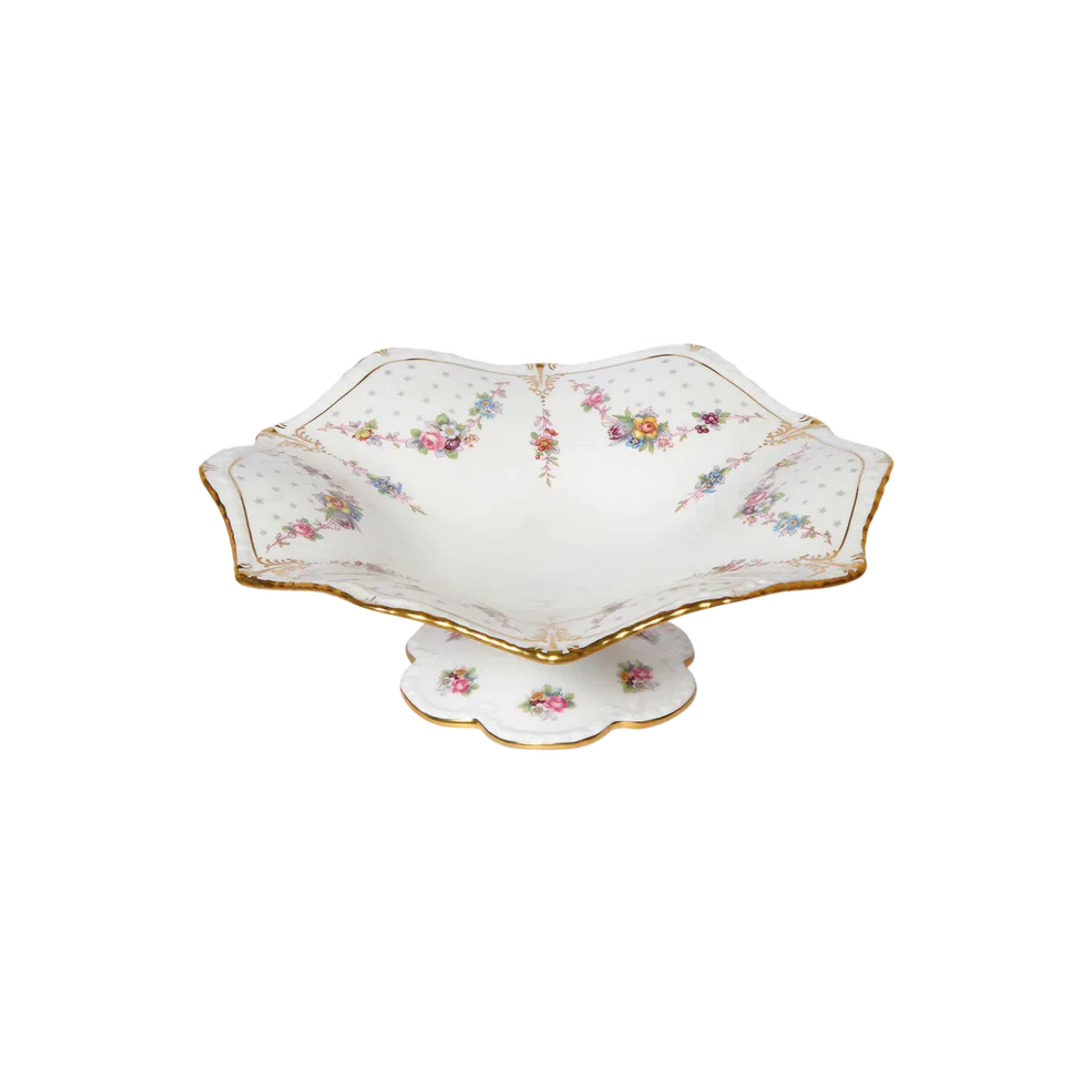 Elevate your dining experience with our Royal Antoinette collection. Crafted from fine bone china, this traditional set boasts a feminine and elegant aesthetic, with a scalloped gold border adorned with delicate florals and stars. Each piece is finished with 22 carat gold, adding a touch of opulence to every occasion.