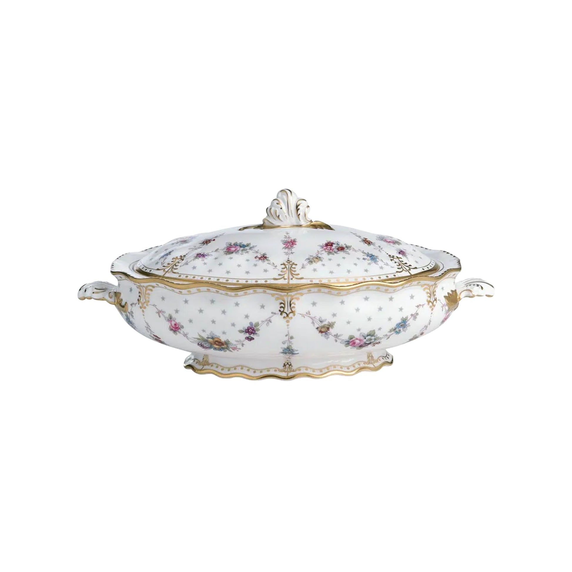 Elevate your dining experience with our Royal Antoinette dinnerware. Crafted from fine bone china, this traditional set boasts a feminine and elegant aesthetic, with a scalloped gold border adorned with delicate florals and stars. Each piece is finished with 22 carat gold, adding a touch of opulence to every meal.