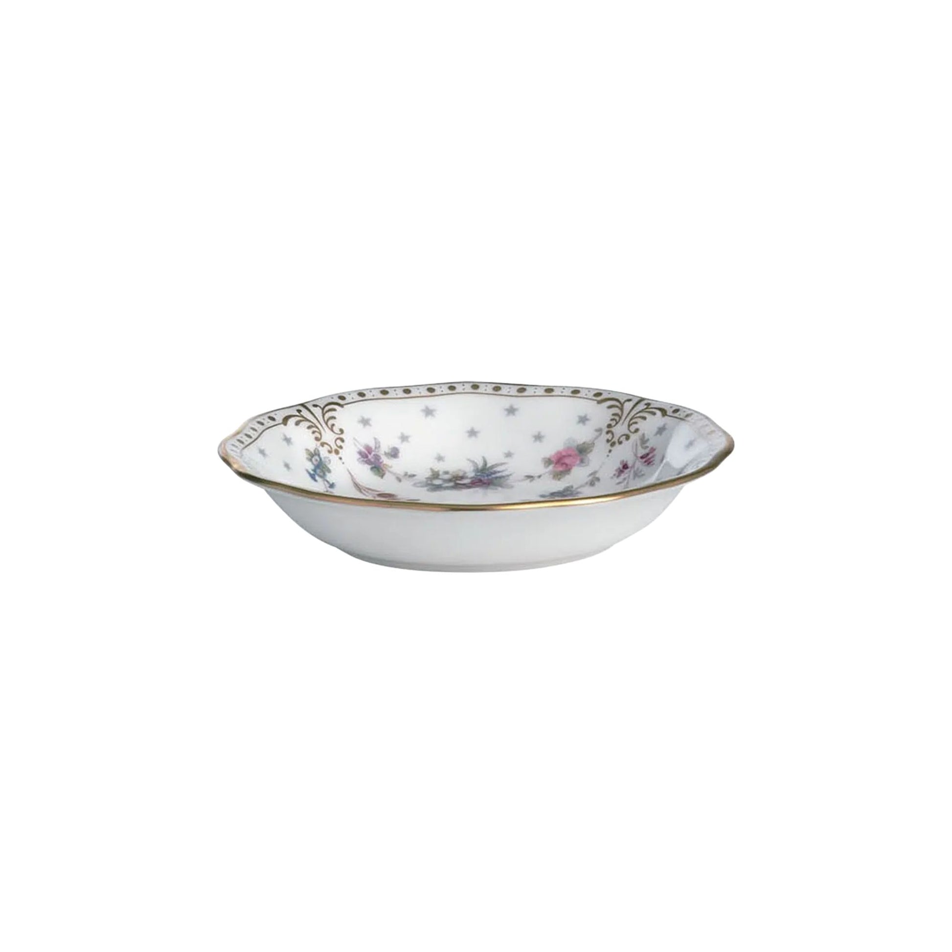 Elevate your dining experience with our Royal Antoinette dinnerware. Crafted from fine bone china, this traditional set boasts a feminine and elegant aesthetic, with a scalloped gold border adorned with delicate florals and stars. Each piece is finished with 22 carat gold, adding a touch of opulence to every meal.